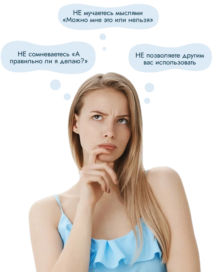 Вы боитесь их осуждения, чувствуете себя обязанной. Часто ощущаете себя ребёнком, которому нужно разрешение.